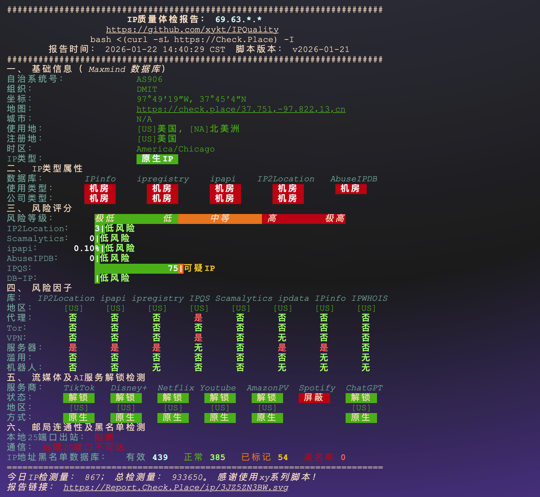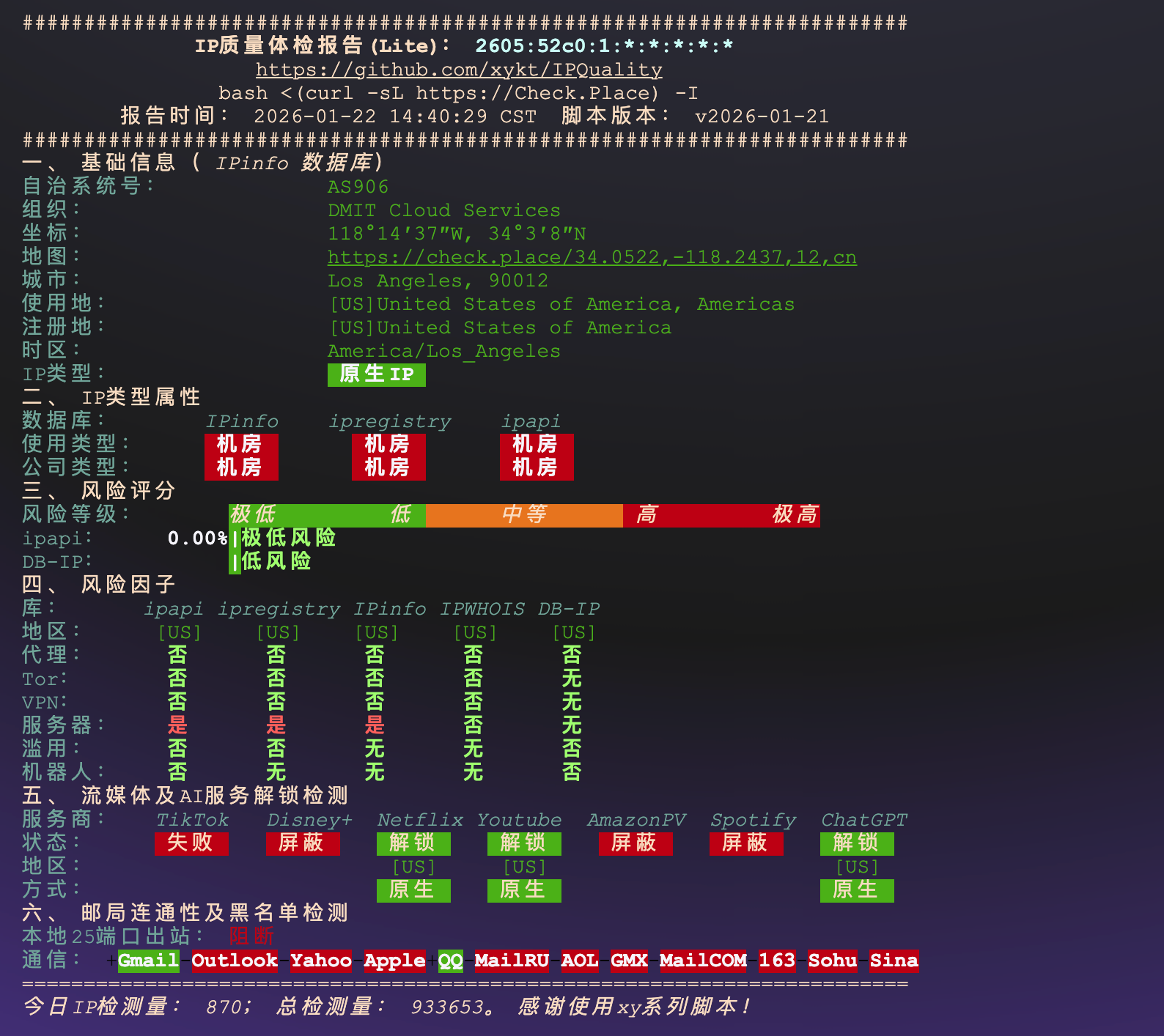 双栈均为原生 IP,风险评分极低,未被任何主流黑名单收录,IP 质量属于第一梯队。